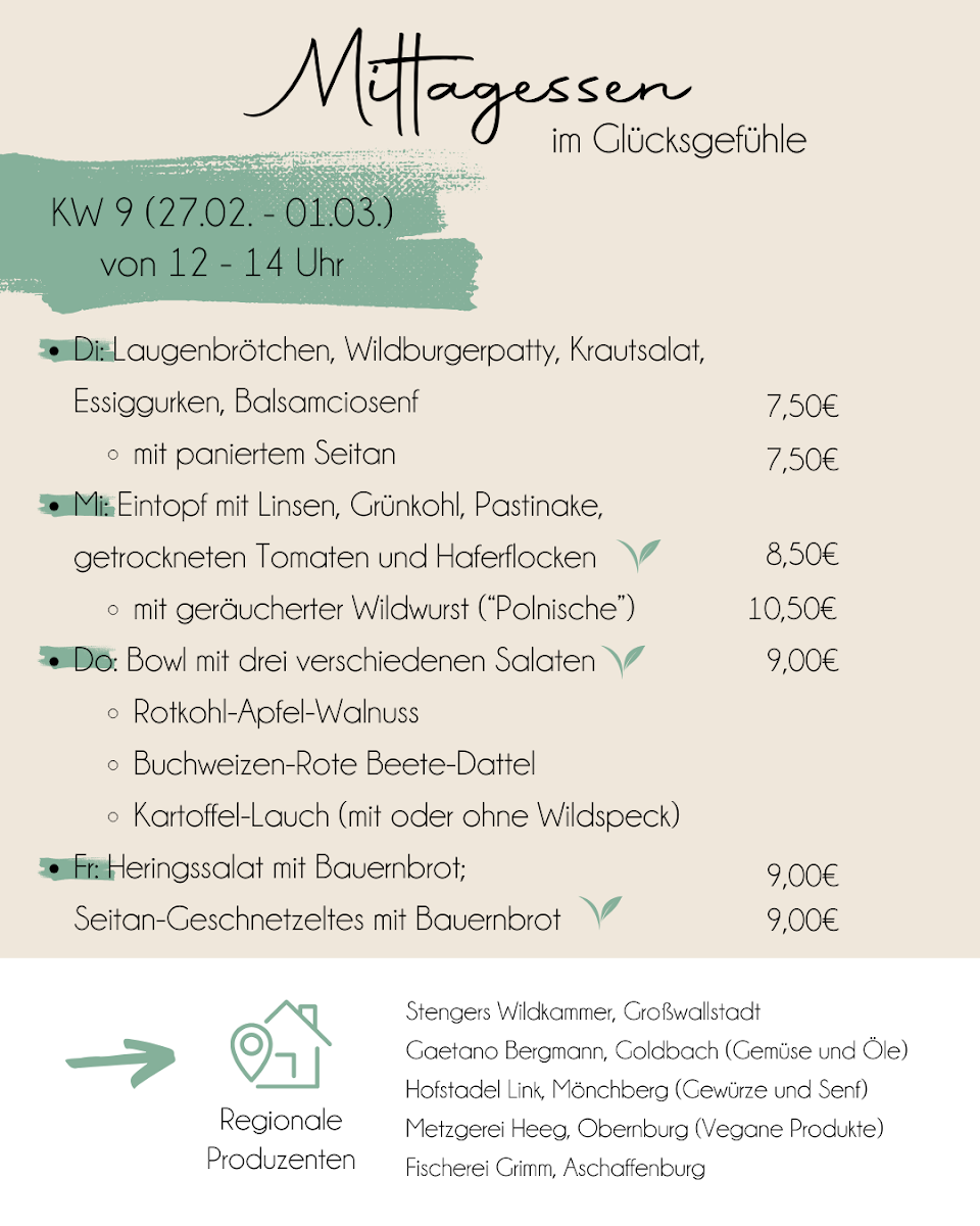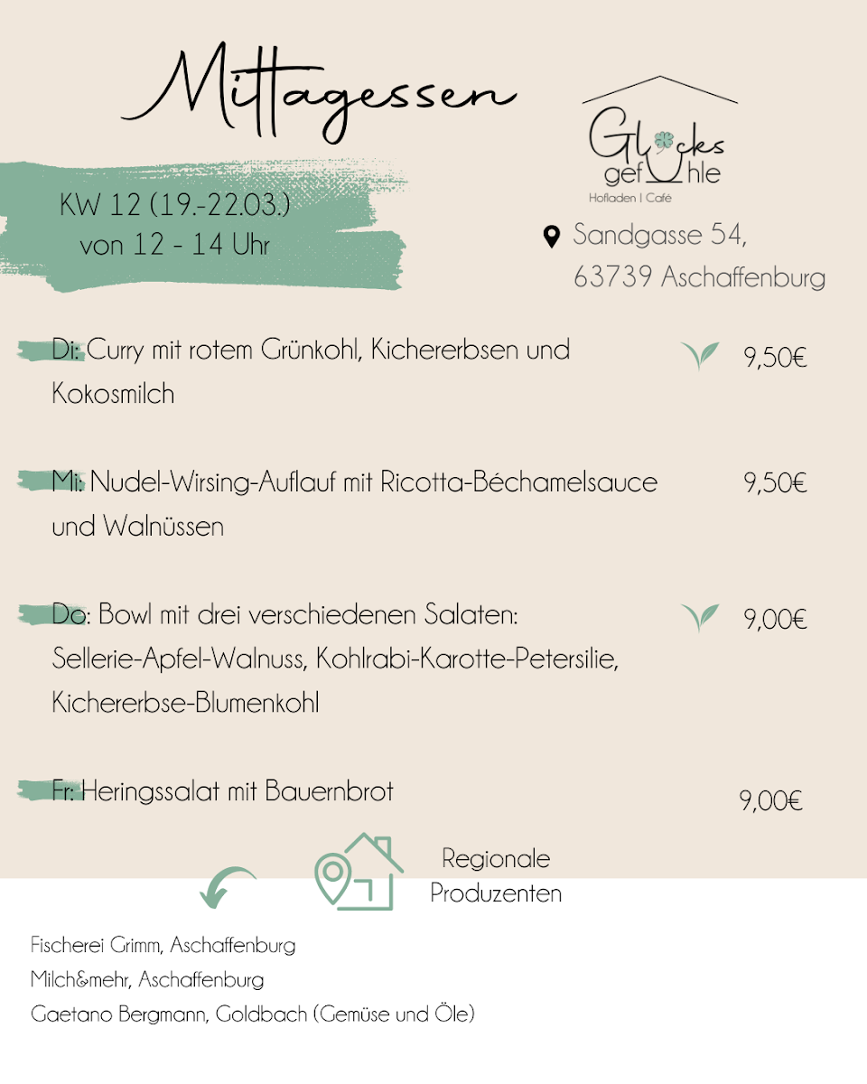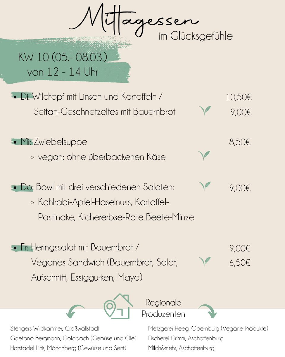 The menu at Glücksgefühle offers a variety of options suitable for different times of the day, including breakfast, coffee breaks, and light meals. Visitors can expect a selection of coffee beverages prepared with a professional espresso machine, along with a range of cakes including vegan options. The food offerings include daily changing lunch dishes, which focus on fresh and seasonal ingredients.